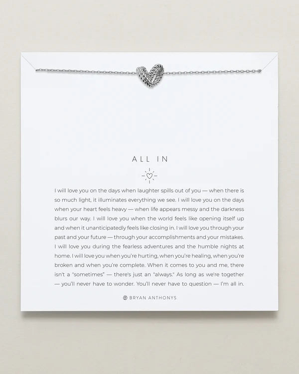 I will love you on the days when laughter spills out of you — when there is so much light, it illuminates everything we see. I will love you on the days when your heart feels heavy — when life appears messy and the darkness blurs our way. I will love you when the world feels like opening itself up and when it unanticipatedly feels like closing in. I will love you through your past and your future — through your accomplishments and your mistakes. I will love you during the fearless adventures and the humble nights at home. I will love you when you’re hurting, when you’re healing, when you’re broken and when you’re complete. When it comes to you and me, there isn't a "sometimes” — there's just an "always." As long as we're together — you’ll never have to wonder. You’ll never have to question — I’m all in.
